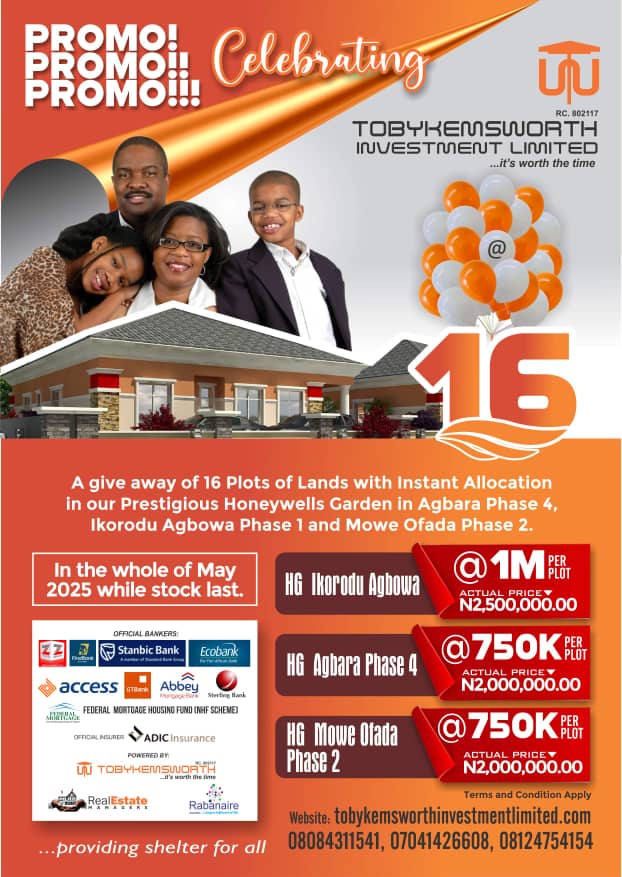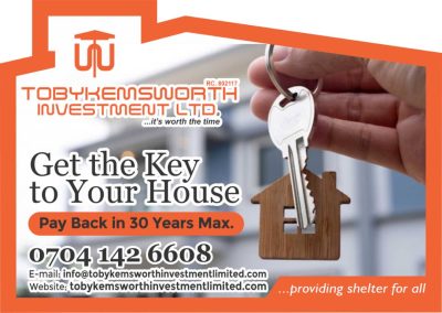 Tobykemsworth Investment Limited First Floor, Abbey Mortgage Bank Building, Km 5, Lasu Isheri Road , First Gate Bus Stop , Igbo Elerin Junction Iba. Lagos